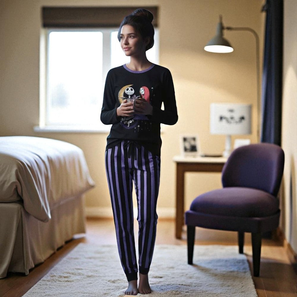 The set consists of a purple and black striped pant, designed to keep you warm on cold nights. Additionally, the t-shirt features the iconic Jack and Sally characters, giving it a fun, thematic touch.